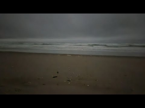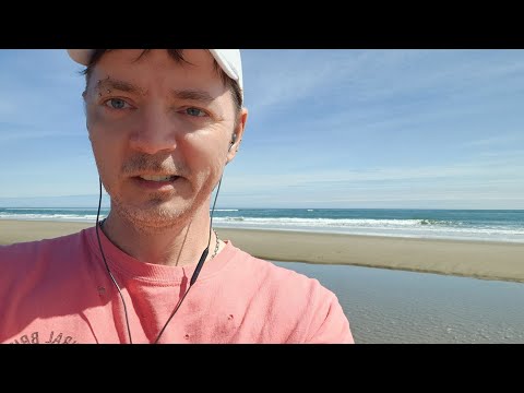rswfire takes a walk to the ocean after a 12-hour day, describing it as a week of controlled chaos. He walks through Siltcoos dunes on the Oregon coast, noting the area is empty except for him. The walk involves climbing a steep dune to reach the ocean. He describes the terrain - ATVs go to the right, hiking trail and river to the left. Upon reaching the ocean, he greets it directly and walks along the waves toward a river, commenting on the wave patterns. Throughout the walk, he makes repeated vocalizations of 'heat' and mentions few footprints from other visitors that day.