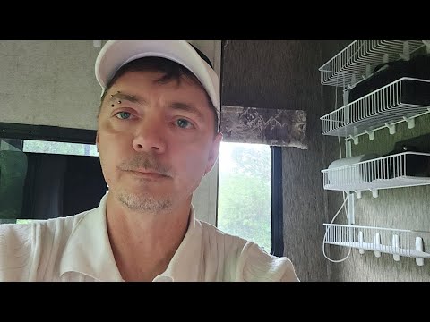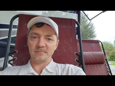 rswfire extends his RV awning as rain begins, working around low battery power (11.73 volts) and mechanical issues with a sticky arm that needs WD40. He sets up chairs under the awning for protection and secures equipment with tarps. **Equipment management** includes moving his grandmother's pig decoration and discussing his inverter setup for making coffee outdoors. He reflects on **life adaptation**, noting how tasks that were challenging a year ago (emptying tanks, using systems) are now second nature, while he continues learning new skills like fishing. He mentions wanting to set up his tent structure for laptop work but needing a proper surface. **Financial needs** are discussed, including items on his Amazon wish list like new shoes (his current left shoe is cutting his foot after only 3 months). Weather prevents a beach trip due to forecasted rain all week. The transmission concludes with rswfire **addressing criticism** from video comments about owning expensive financed vehicles (RV and Jeep) while asking for help. He explains these were financed when he had perfect credit a year ago, that he's now behind on payments, has no power in the RV, and made strategic decisions to transition his life ahead of anticipated societal changes. He expresses frustration with people's shallow judgments and disconnection, stating he only wants to connect with like-minded individuals to build a better future.